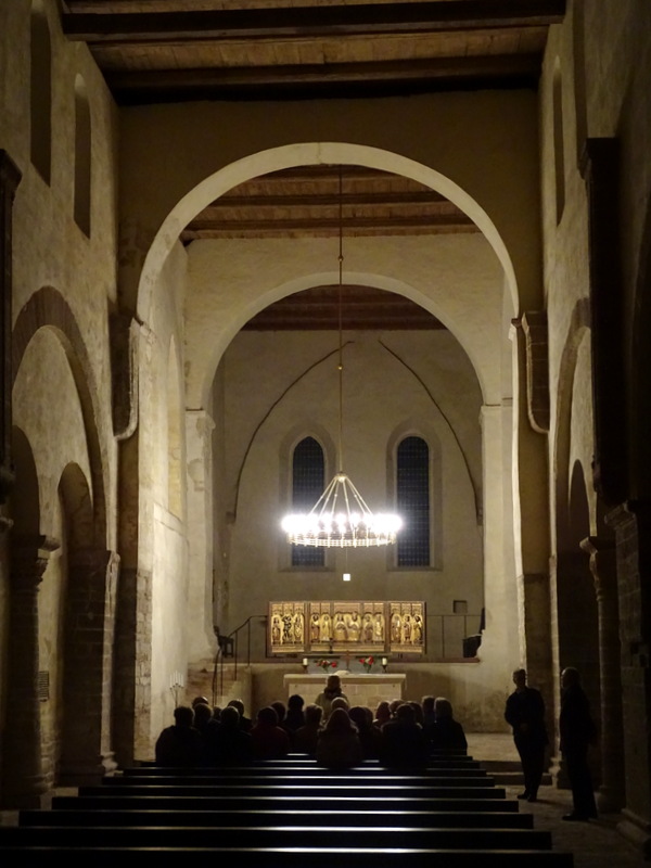 Als Ableger des Klosters Corvey wurde es zum ersten mal 877 in einer Urkunde erwähnt.Später stellte sich diese als Fälschung heraus. Wissendschaftlich belegt ist jedoch eine Urkunde Otto I. vom September 960. Während der Reformationszeit und der Bauernkriege kam das Klosterleben zum Erliegen bis 1678 die Gebäude den Grafen zu Stolberg-Wernigerode zugesprochen wurden welche hier ein evangelisches Damenstift einrichteten.(Hier soll unter anderem die aus Dänemark stammende Frh. von Uften für kurze Zeit gewohnt haben). Die evangelische Kirchenprovinz Sachsen übernahm 1946 das Kloster und nutzte es als Erholungs-und Tagungsstätte. Seit 1996 sind außerdem das Pädagogisch-Theologische Institut, das Pastoralkolleg und das Haus der Stille angesiedelt. Nach dieser Einführung besichtigten wir die Klosterkirche St.Vitus. Der Vorgängerbau stammte aus dem Jahr 1004. Im 12.Jahrh. entstand der Westriegel mit den beiden Türmen und der Chor. Das Kirchengebäude wurde im Bauernkrieg schwer zerstört und 1599 legte eine Räuberbande einen Brand. Die Kirche wurde notdürftig repariert bevor in der Barockzeit einige Umbauten erfolgten. Ab 1950 wird versucht den Originalbau wieder herzustellen. Im Inneren der relativ schmucklosen Kirche fallen insbesondere ins Auge der dreiteilige Altaraufsatz mit spät-gotischem Schnitzwerk, welcher im Halbrelief, flankiert von Heiligen, die Krönung Marias durch Christus zeigt. Im Westchor zeigt eine moderne Holzplastik, aus einem einzigen Eichenstamm geschnitzt, den gekreuzigten Jesus. Da nach Aussage des Künstlers Franz Gutmann das Gesicht Jesus nicht bekannt ist, hat er nur die Haare, den Bart und die Dornenkrone dargestellt. Ebenfalls im Westchor symbolisiert ein abstrakter Kerzenständer den "Brennenden Dornenbusch".
